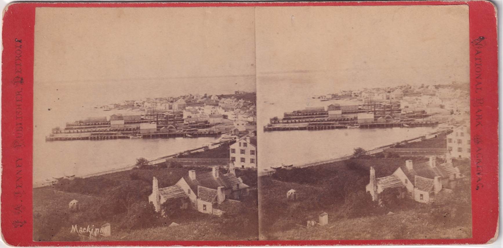 SV12 – Wrecking Steamer Magnet at Mackinac Island, July 1873 – This is an original stereoview card by Michigan stereoview maker James A. Jenney and is on his original cardstock. It shows a scene overlooking the docks on Mackinac Island. The view can be dated by the presence of the big sidewheel wrecking tug Magnet, which is visible at the dock with her name legible on the sidewheel. This is one of a series of views made that day showing the Magnet. The card is in VG condition and is very sharp, allowing the name on the sidewheel to be resolved. The card is uncommon but I’ve seen several on the market in the last 20 years. Asking $40 |