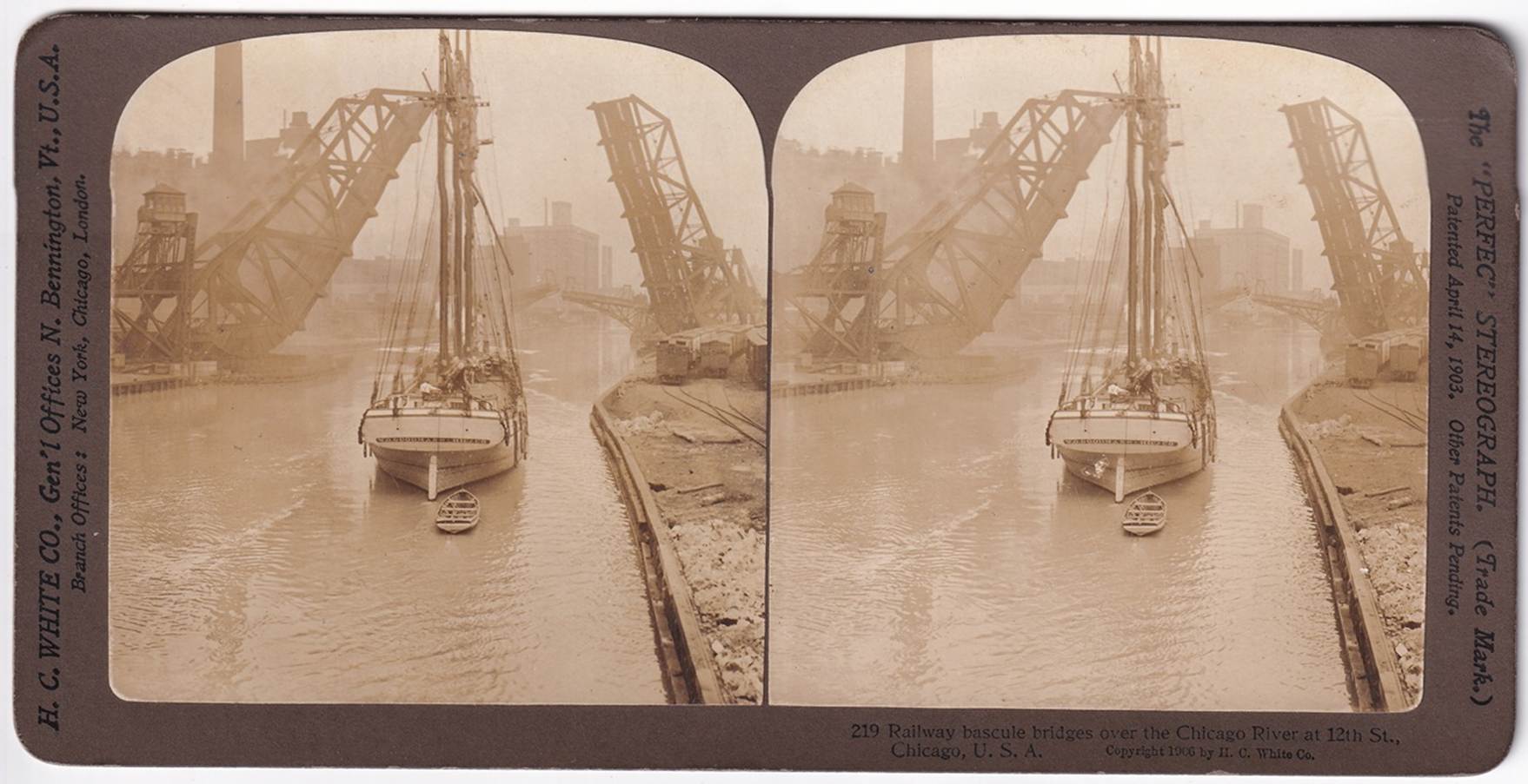 SV18 – Schooner W.O. Goodman at Chicago, c. 1900 – This is a relatively modern H.C. White stereoview made about 1900. It is a deeply curved card on gray cardstock, typical of later, mass-produced lithograph cards. This example is in VG condition with very mild fading. The view shows the Manitowoc built schooner W.O. Goodman (1882-1917) being towed under one of Chicago’s bascule bridges. The Goodman went to the coast in 1906, sailing out of Boston and was abandoned around 1917. This is one of only two known views of the Goodman. Despite being a later commercially mass-produced stereo it is relatively uncommon with examples coming on the market every other year or so. Asking $30 SOLD |