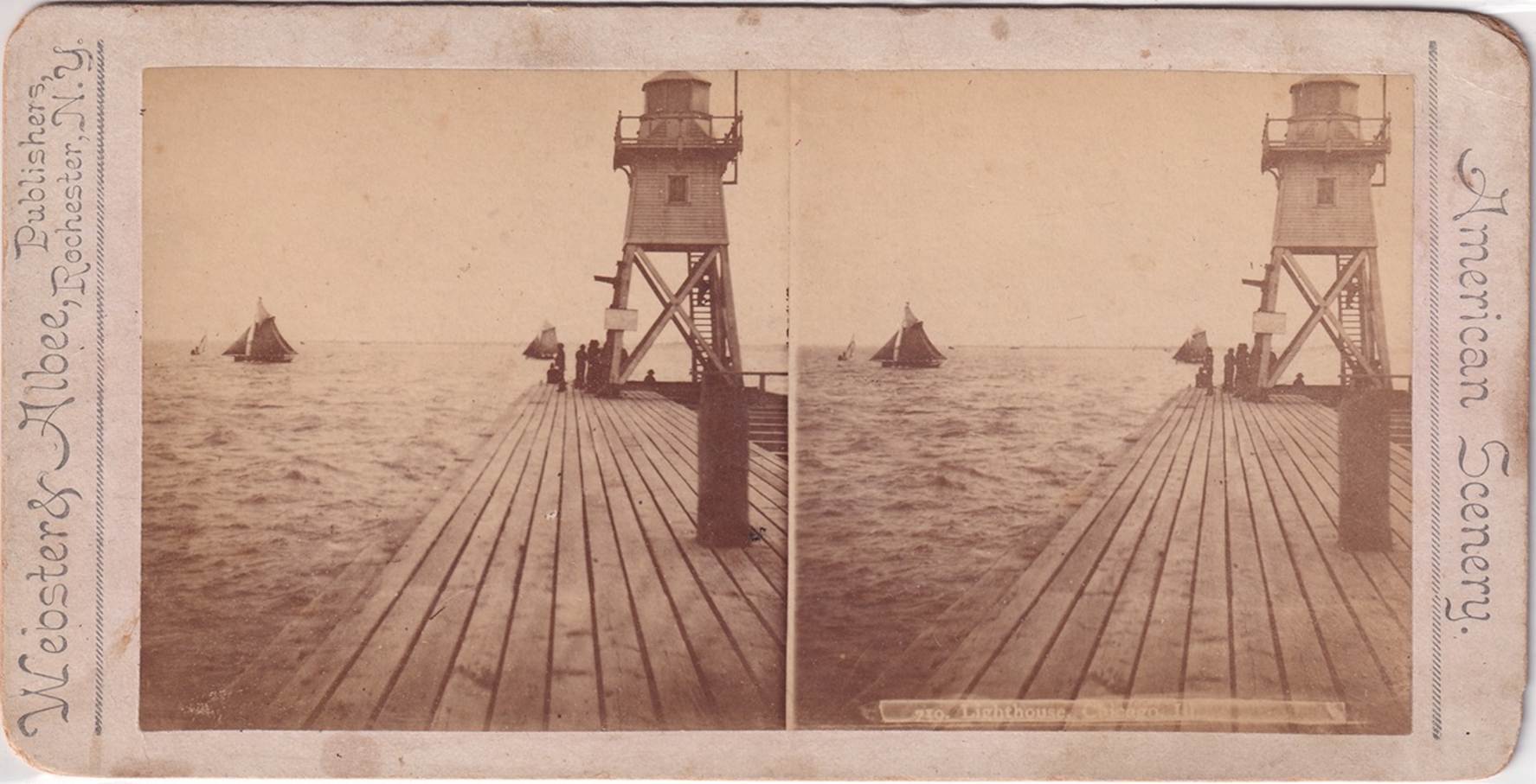 SV22 – Chicago Pierhead Light c. 1890 – This stereoview was published by Webster & Albee of Rochester, New York in about 1892. Webster & Albee were not photographers themselves but publishers who made stereoviews of scenery from many parts of the country. Their Great Lakes views are very collectable and are generally quite sharp. This card shows a nice closeup view of he rarely photographed Chicago pierhead light. The card itself is fairly common although no instances of it are being offered anywhere else at the time of this listing. The card is in VG condition. Asking $20 |