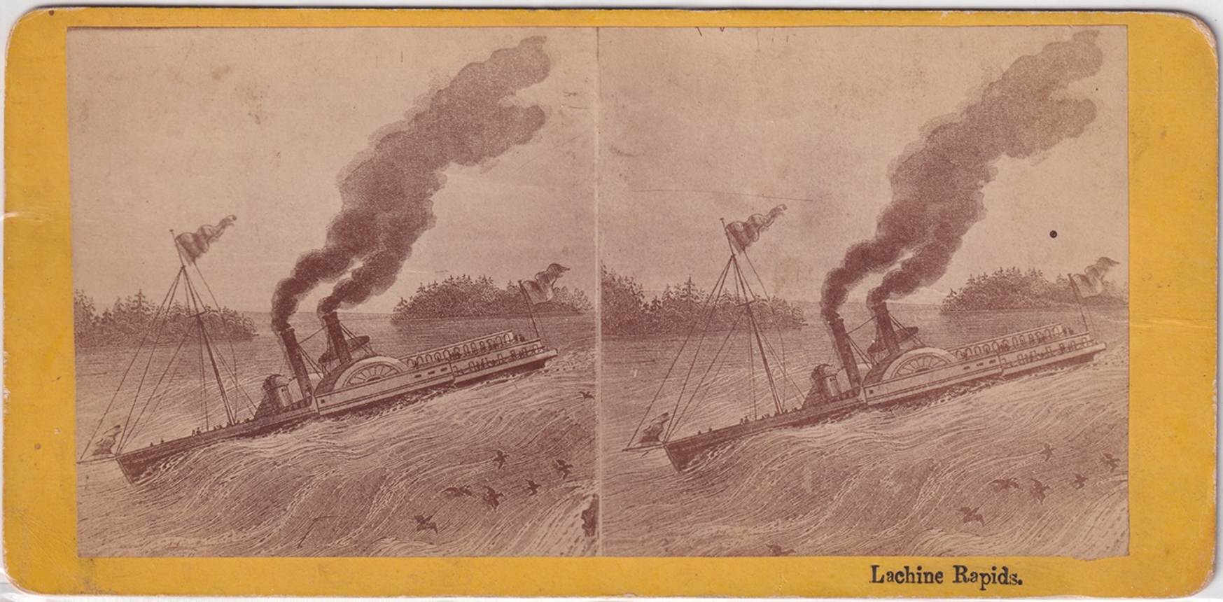 SV9 – Steamer Corinthian in the LaChine Rapids – This is an original stereoview card by J.G. Parks of Montreal. It shows the sidewheel steamer Corinthian running the LaChine Rapids near Montreal in about 1880. The narrow channel through the rapids was always treacherous, eventually necessitating the construction of the LaChine Canal to bypass them. Many vessels wrecked or were damaged running the rapids and several stereoviews were made of early vessels in the rapids, mostly by J.G. Parks. This card is in VG condition and is a nice, sharp example. Views of vessels in the LaChine Rapids are fairly common but have become increasingly collectable. Asking $20 |