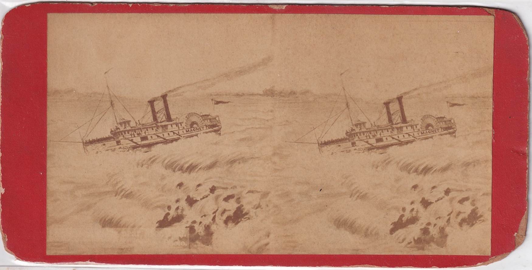 SV29 – Steamer Magnet in the LaChine Rapids about 1874 – This stereoview was made at Montreal in about 1875 by J.G. Parks. It shows an artist conception of the early steamer Magnet (1847-1903) braving the rapids in about 1874. The card is in VG- condition with wear to the corners but the images are unaffected. This view is quite common and similar examples are asking about $20. Asking $20 |