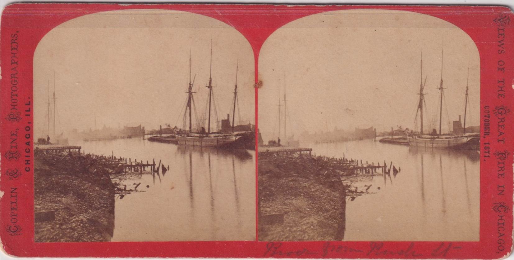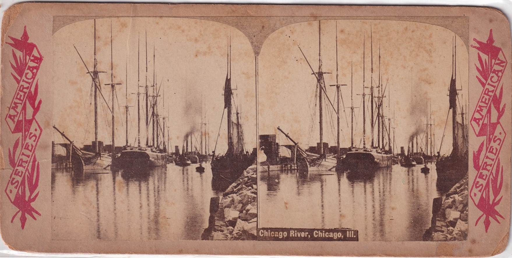 SV37 – Chicago River Immediately after the Fire – This Copelin and Hine view shows some of the first schooners to enter the Chicago River after the Great Fire of 1871. Copelin and Hine lost their studio in the fire but saved their equipment. This ghostly view shows the still-smoldering remains of the area west of the Rush Street Bridge. The schooner isn’t identifiable, but the card is uncommon. I’ve only seen two instances of it. Asking $50 SOLD |