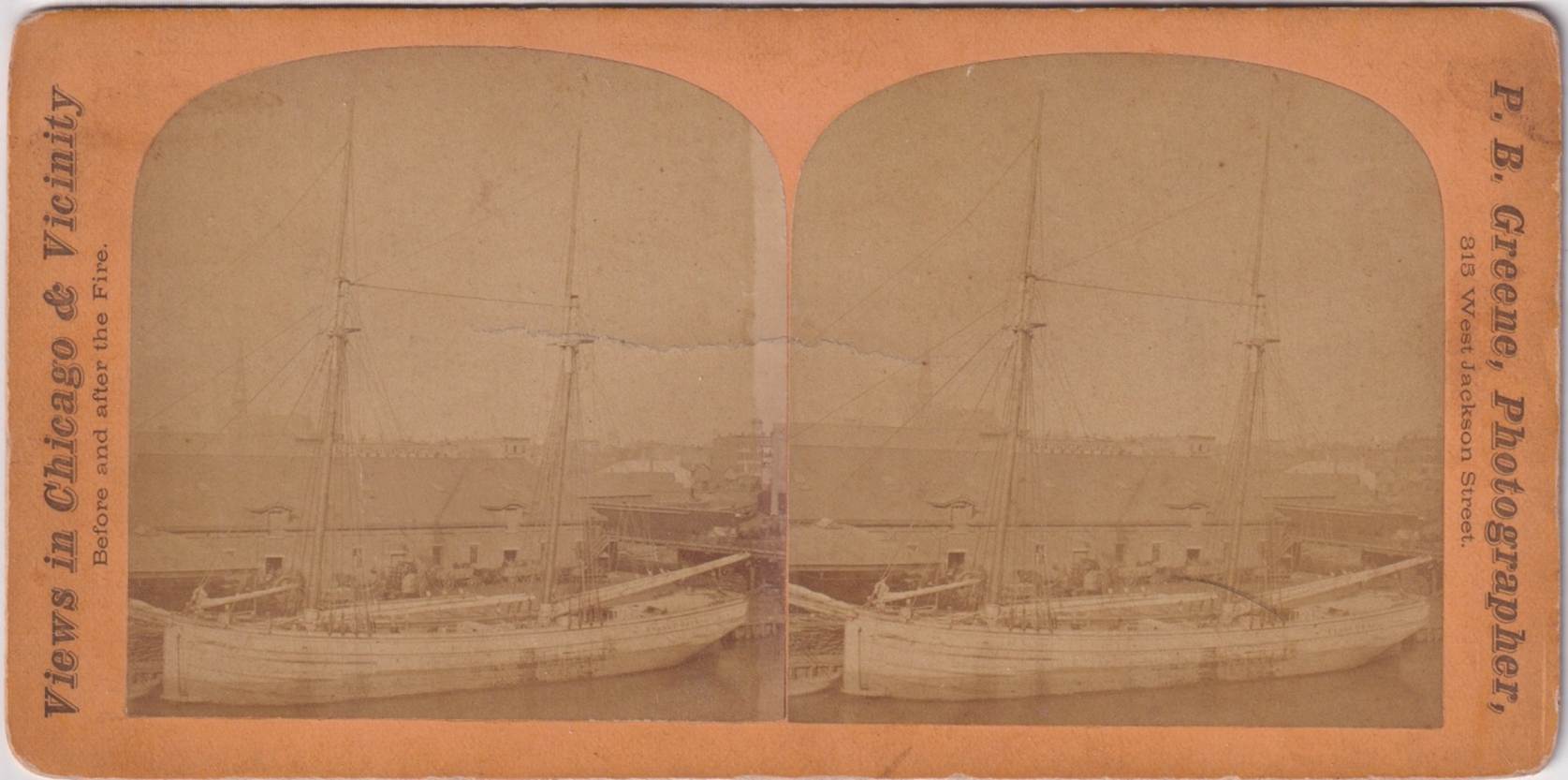 SV30 – Schooner Mary E. Perew on the Chicago River, c. 1880 – This stereoview is a bootleg made about 1882 from an earlier original made by the Gates Brothers in 1880. The card shows the only known photo of the schooner Mary E. Perew (1861-1905). Her name is nicely visible on the original Gates Brothers example which is in my collection. The vessel to her left with the ornate cutwater is unfortunately unidentifiable. The bootleg card is considerably lower resolution than the original but is in VG condition. It is fairly common in bootleg form. Asking $25 SOLD |
