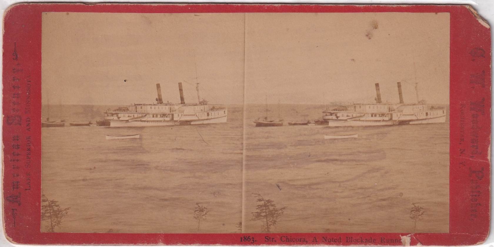 SV39 – The Civil War Blockade Runner Chicora at Duluth c. 1870 – This C.W. Woodward stereoview shows the Civil War Confederate blockade runner Chicora at Duluth about 1870. She was an iron hulled sidewheel steamer built in England in 1864 as the Let Her Be and ran goods to from Britain to the Confederacy through Union blockades. She was brought to the Lakes in 1867 and served as a Canadian mail boat, running to Lake Superior. She served in this capacity for 10 years until she was sold for use on Lake Ontario. She was long-lived in her Lake Ontario service, running until she sank near Howe Island in the St. Lawrence River in 1938. She was often photographed, but views of her on Lake Superior during her career as a mail carrier (1867 – 1877) are uncommon. Asking $30 SOLD |